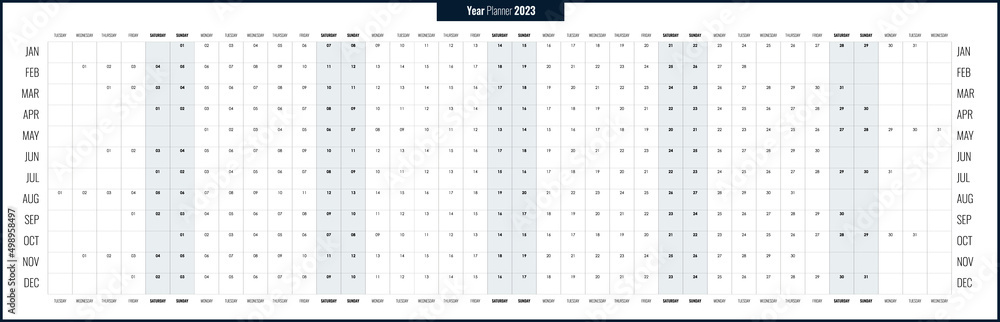 Calendar 2023 year. Linear planner template. Yearly horizontal